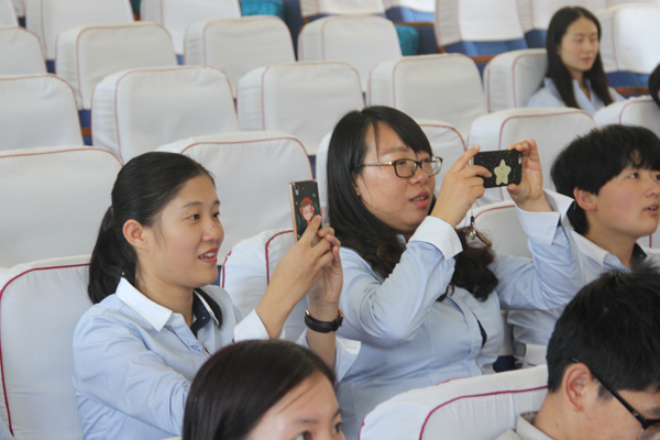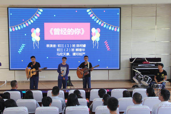 初三年级的四位小帅哥一曲《曾经的你》,自弹自唱却也有模有样,引起老师们的热烈共鸣,纷纷拿出手机摄录他们表演的精彩片段。