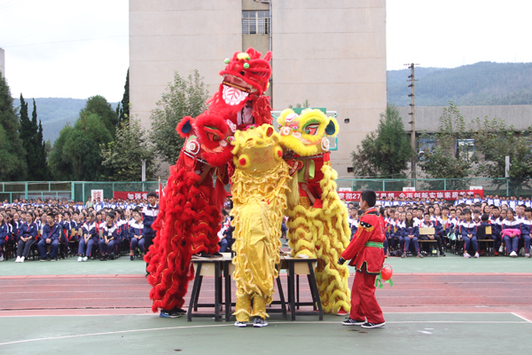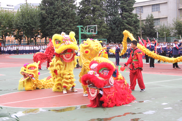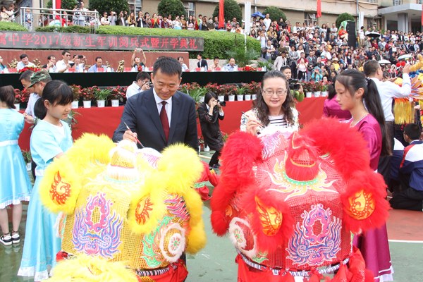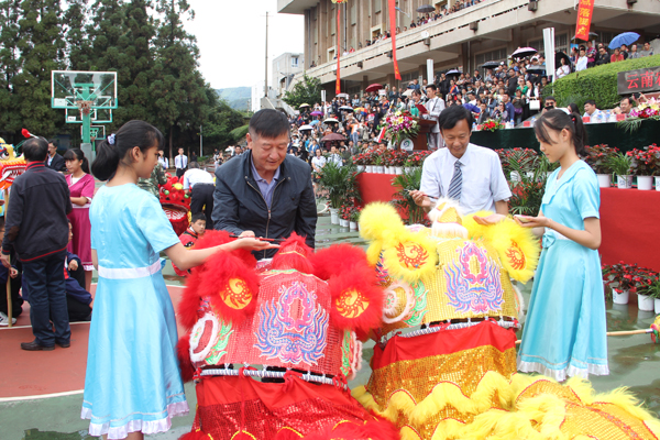 金鼓迎宾,鞭炮齐鸣,大气磅礴的威风鼓表演为典礼拉开了序幕。在喜庆气息浓郁的“雄狮点睛”仪式后,师生舞起八只雄狮,活灵活现带动现场气氛趋向热烈。